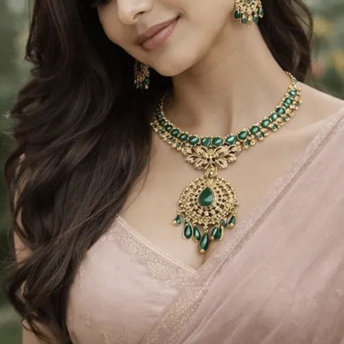 A graceful necklace featuring emerald-green stones, intricate gold detailing, and a stunning statement pendant—perfect for elegant occasions and timeless beauty